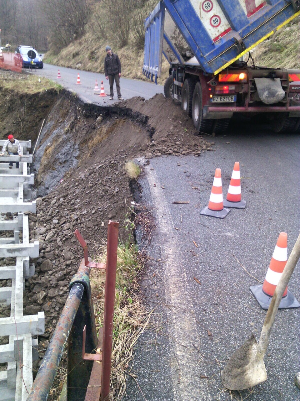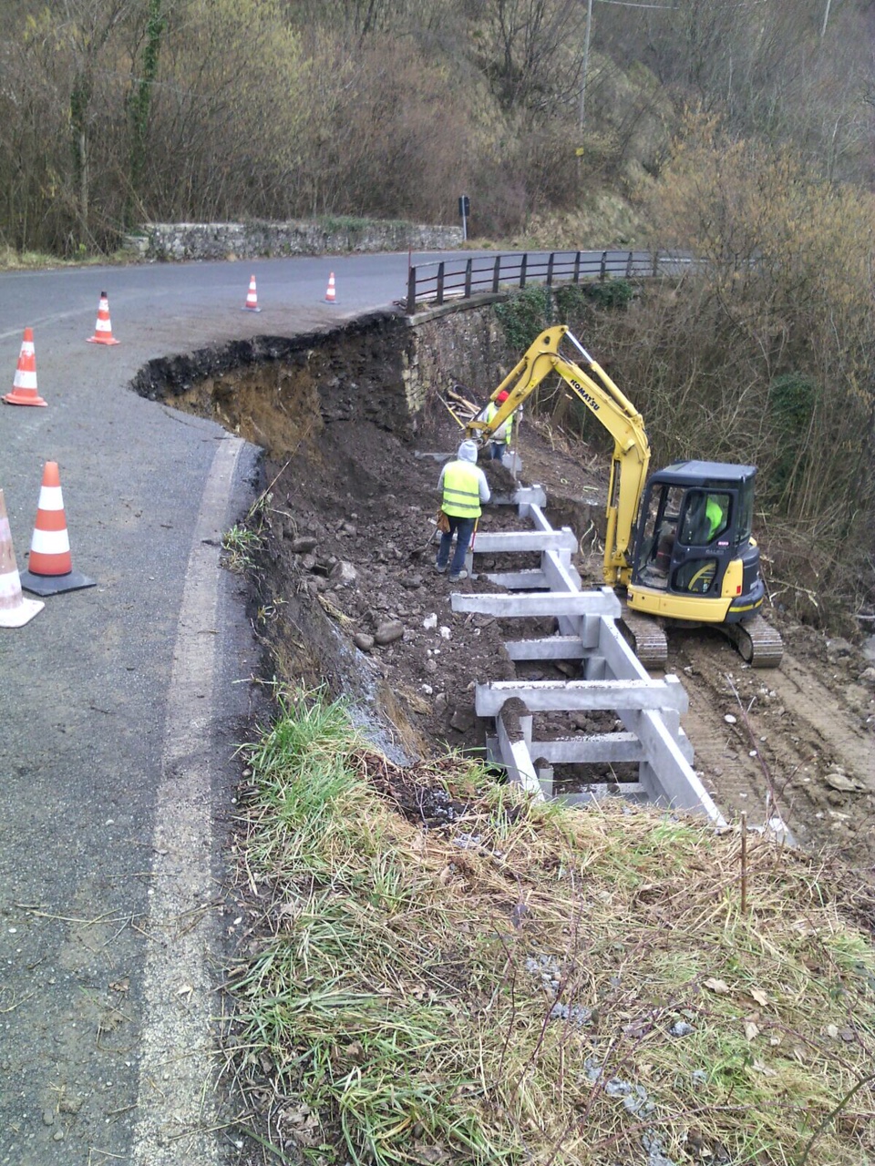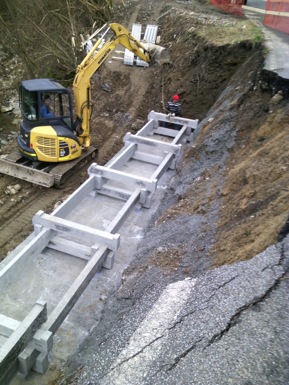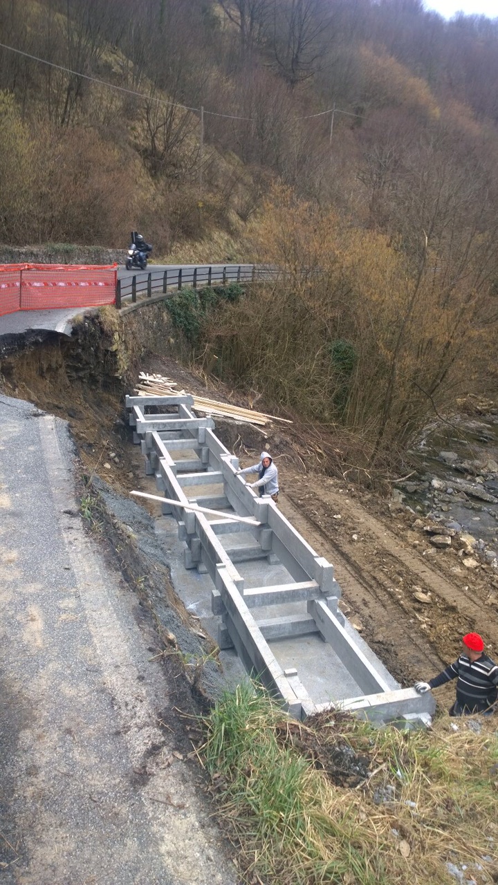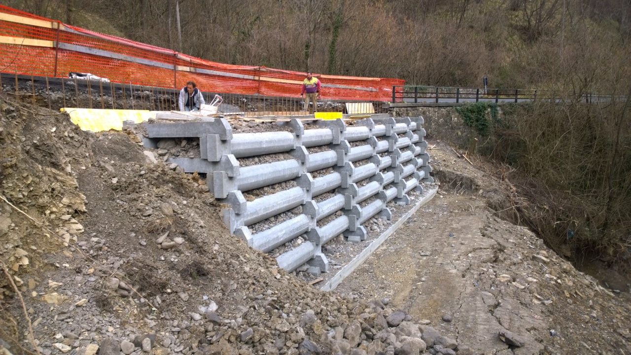 Realizzazione di muro cellulare a gabbia (traviforme), posizionato al di fuori (verso valle) del corpo stradale, a seguito evento alluvionale.
