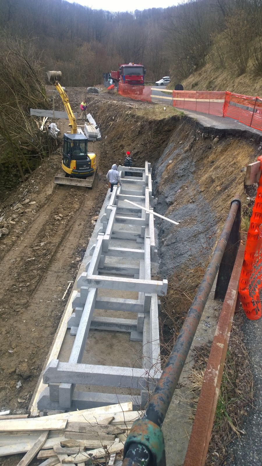 Vista panoramica. Fase di riempimento atergo del muro cellulare a gabbia.