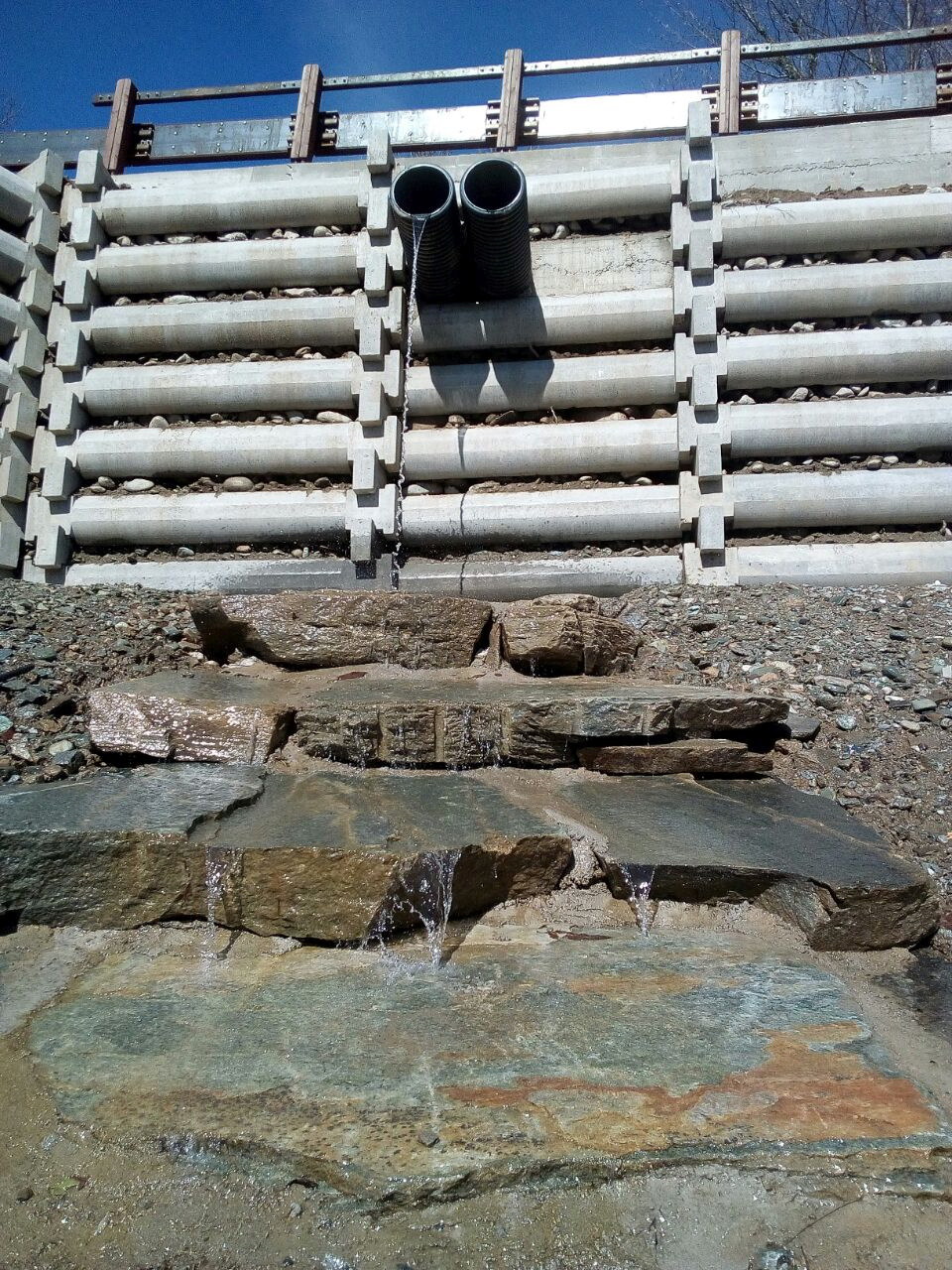 Muro ultimato. Vista prospettica da valle.