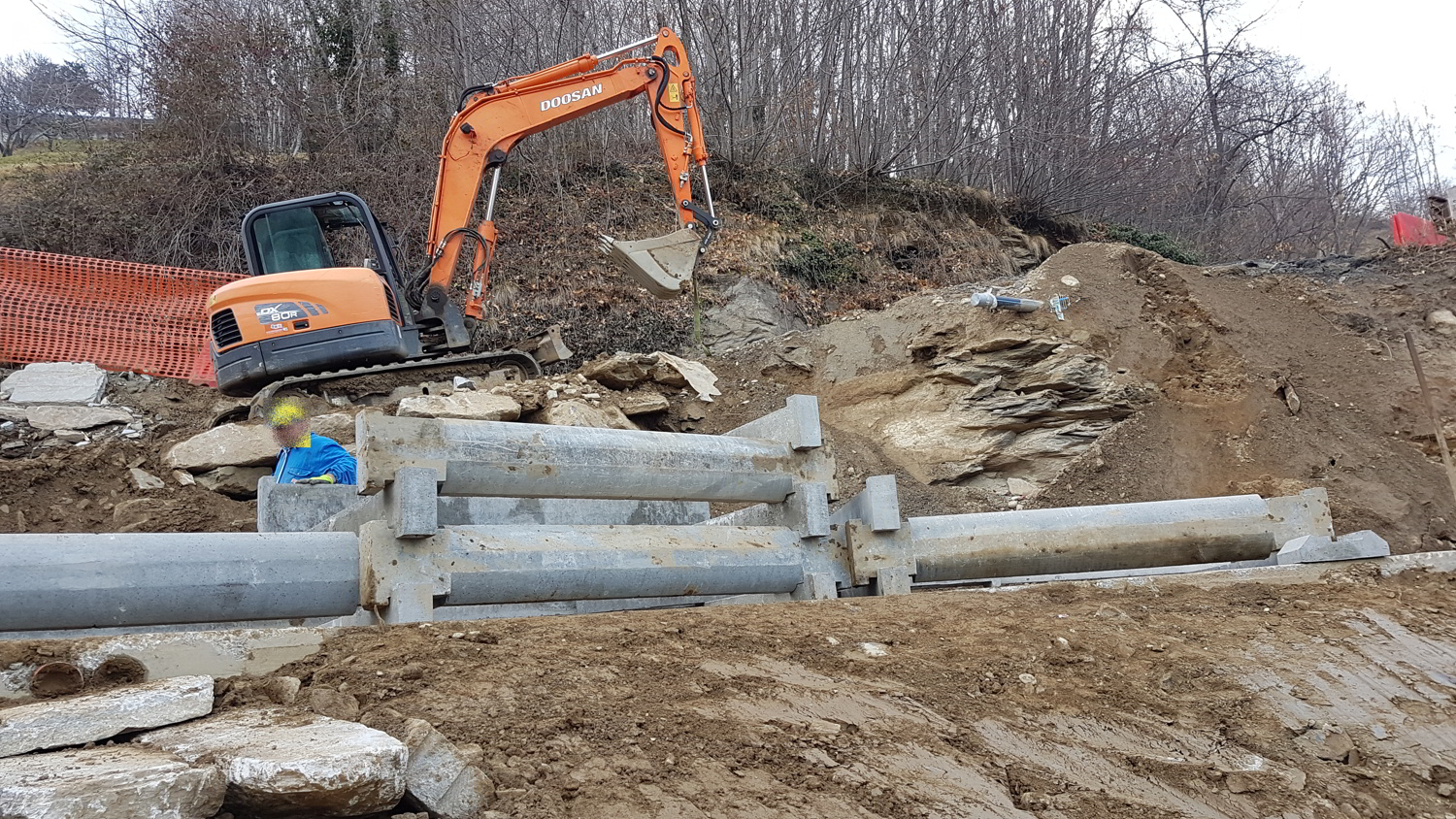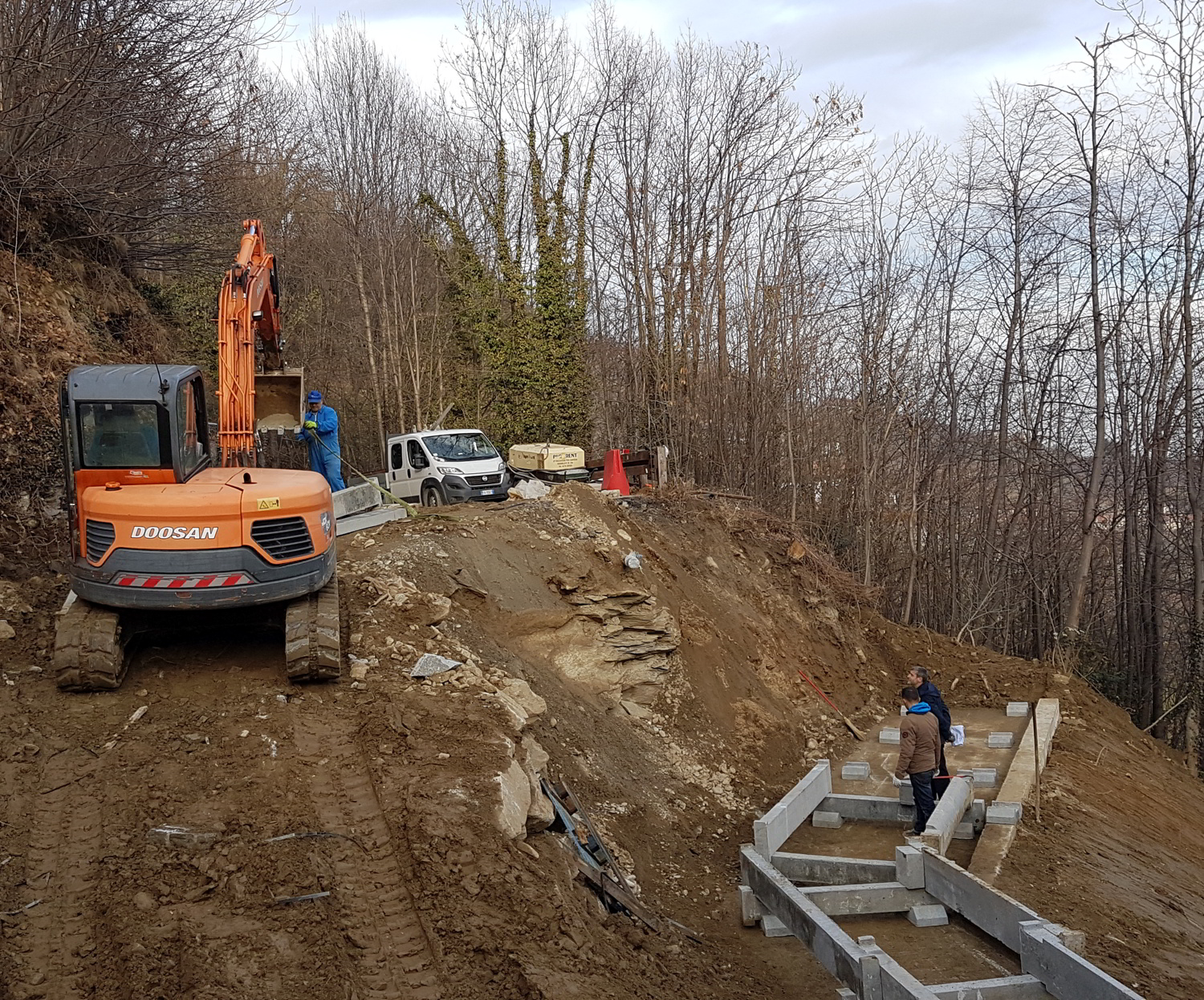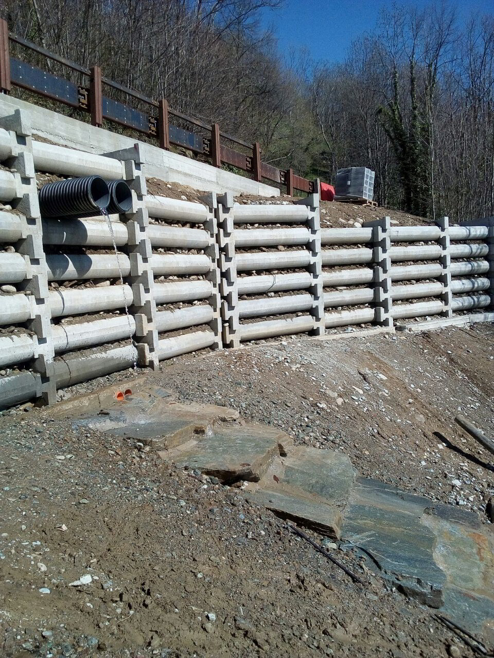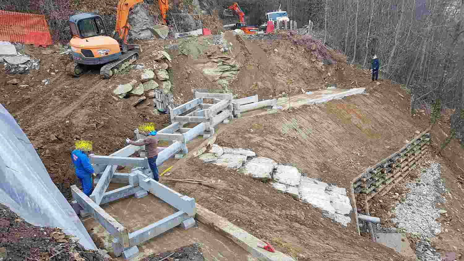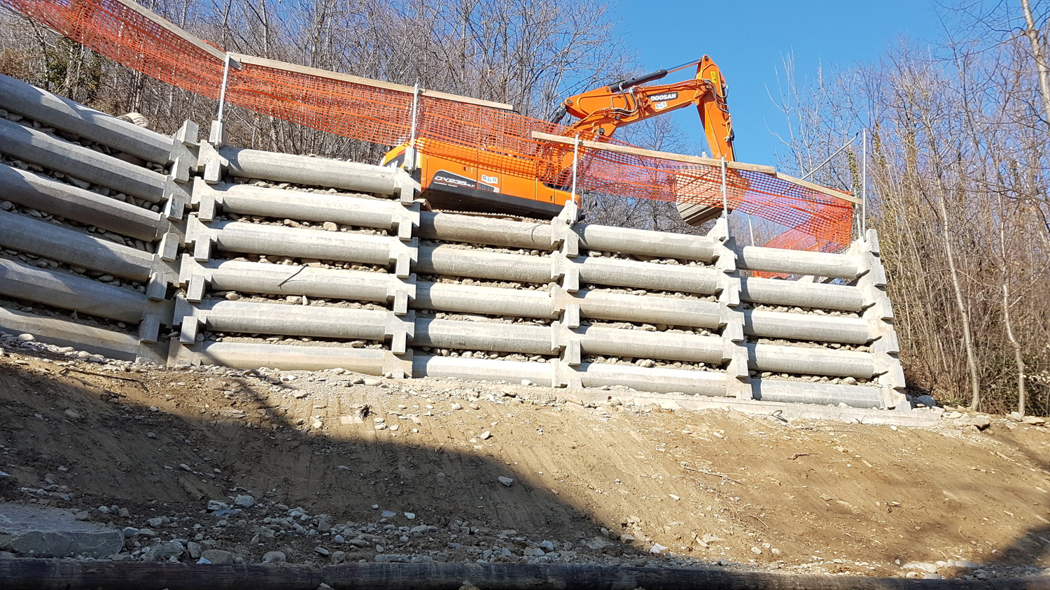 Vista panoramica. Fase di riempimento a tergo del muro cellulare a gabbia.