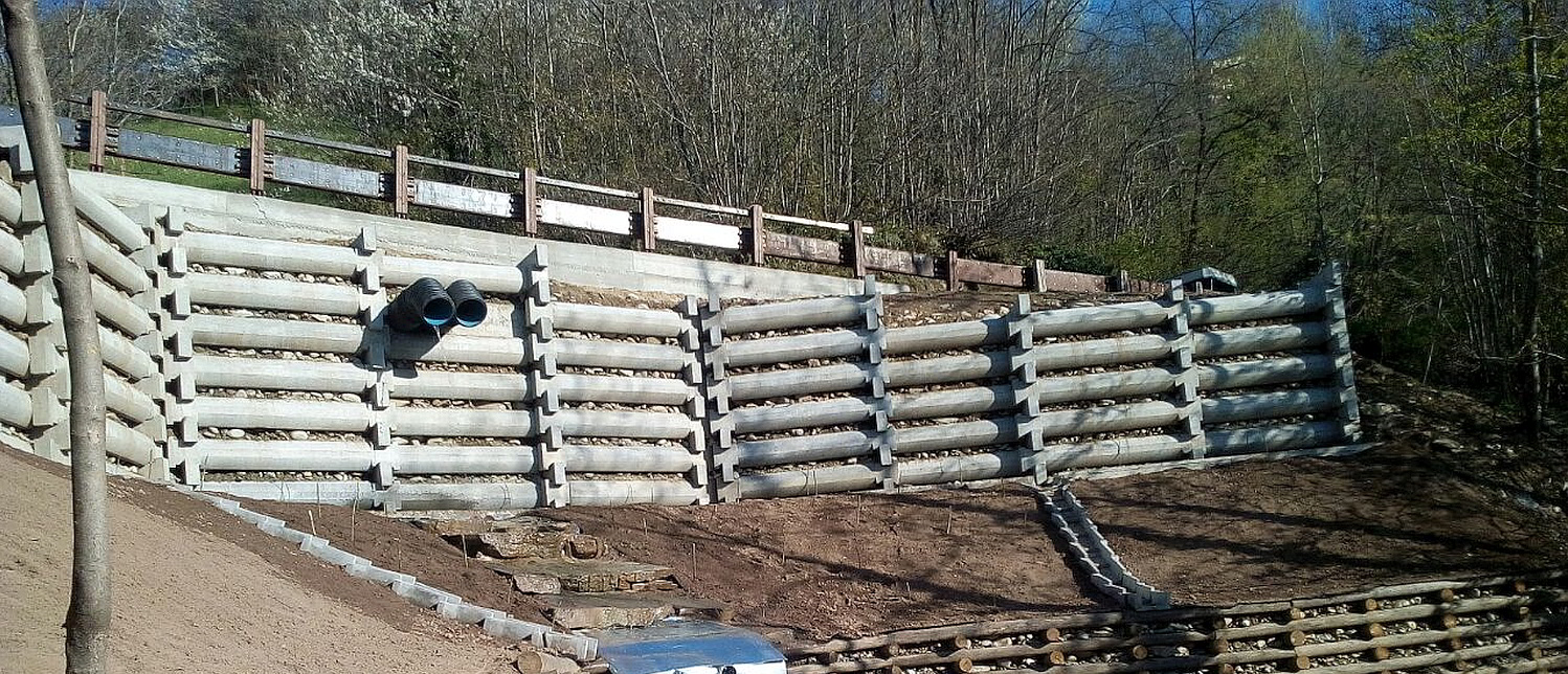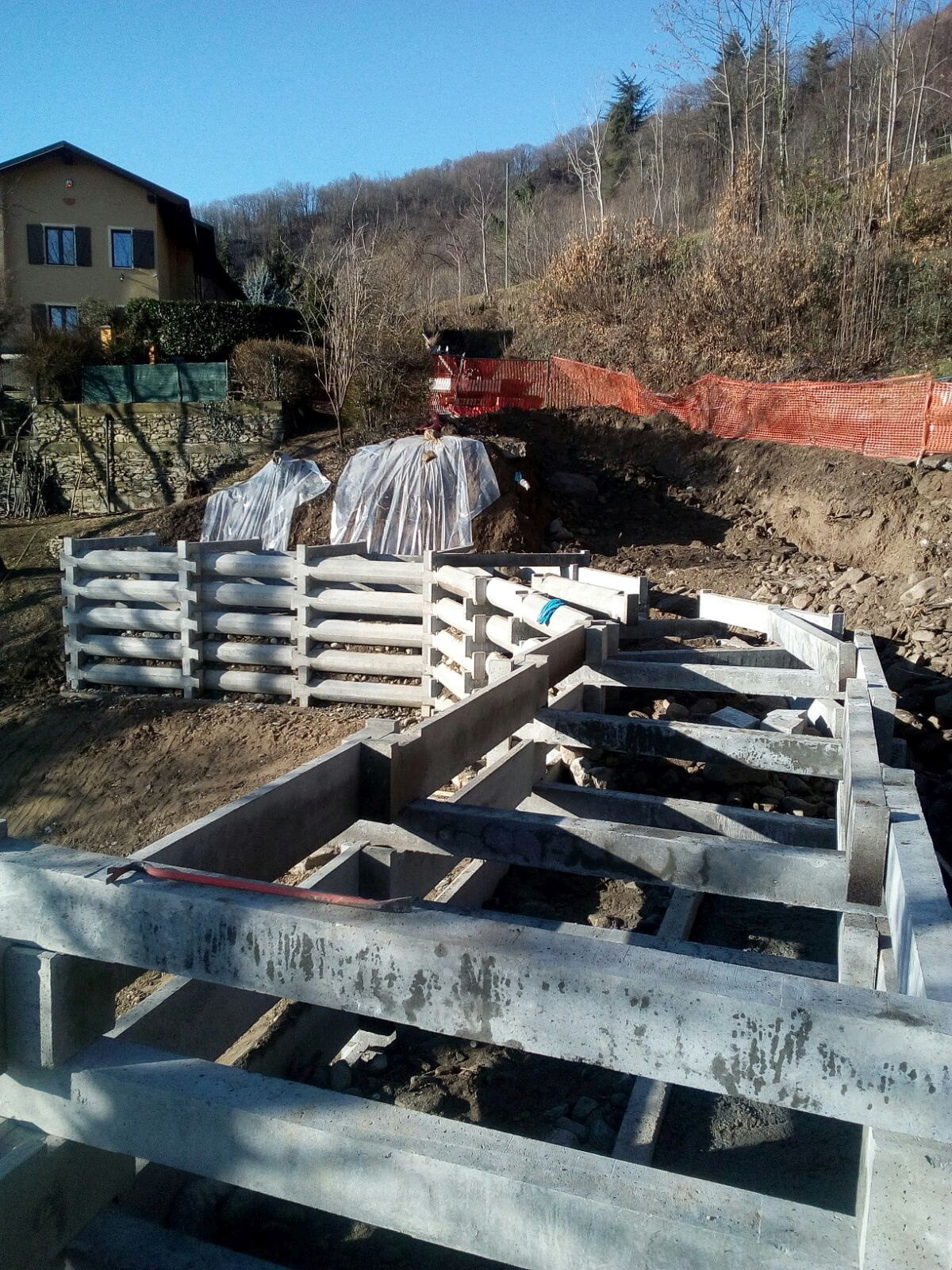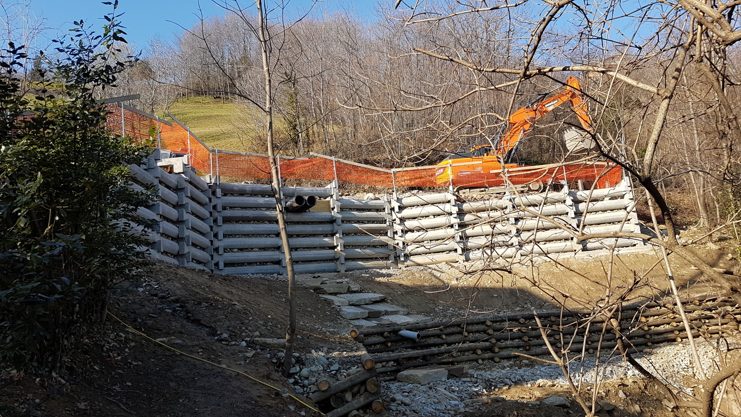 Realizzazione di muro cellulare a gabbia (traviforme), posizionato a forma ferro di cavallo ovvero a doppio angolo, a seguito evento alluvionale.