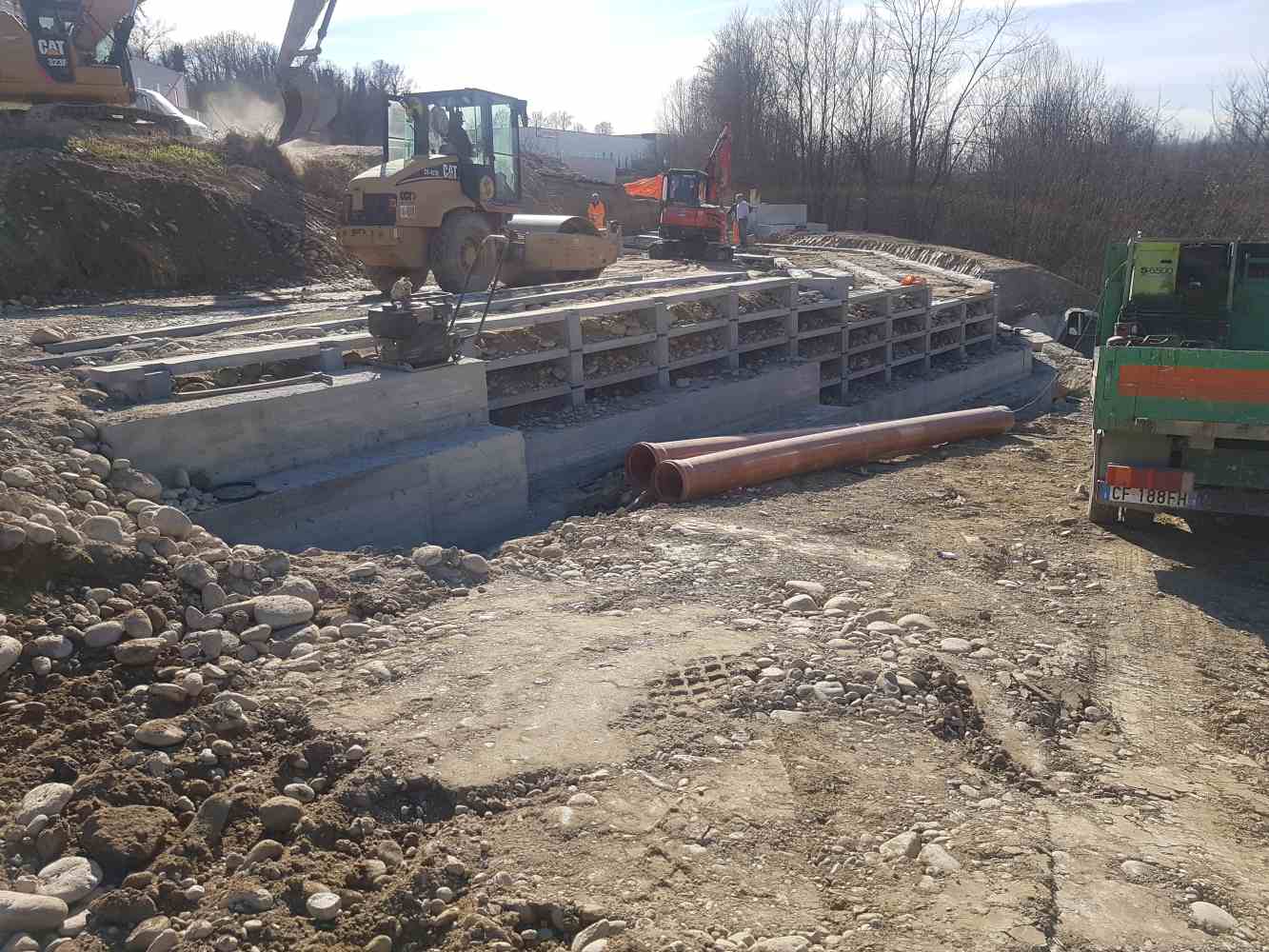 Fase di montaggio: fase di compattamento a tergo del muro cellulare Fase di montaggio: vista complessiva Muro ultimato. La particolarità è la soluzione con gradonatura in sommità Muro ultimato - particolarità: creazione di angolo con elementi standard adattati in cantiere Muro ultimato - particolarità: realizzazione di muro con gradonatura costante in modo da seguire la pendenza della sede stradale